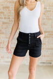 Step up your shorts game with the Reagan High Rise Button Fly Trouser Shorts from Judy Blue! These high-waisted shorts feature a coordinating button fly and a saturated black color for a sleek and stylish look. With trouser pockets and a non-distressed design, these shorts are both functional and fashionable. Perfect for any summer occasion.