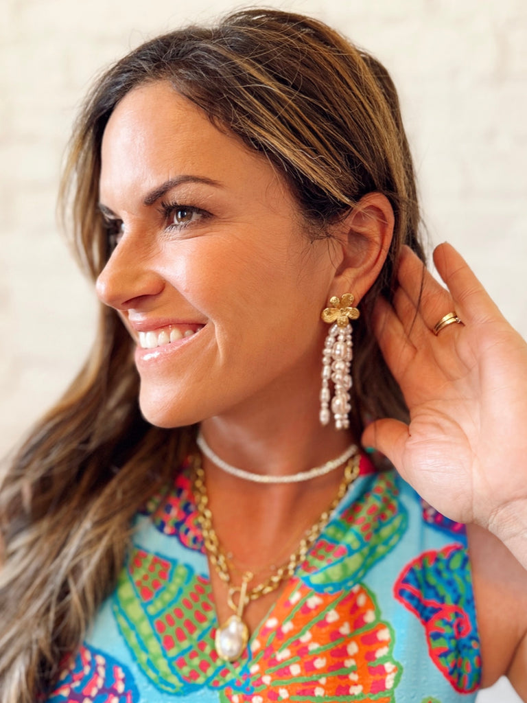 - 18K Gold Plated, Stainless Steel Tropical Flower Earrings with Dangling Pearl Strands