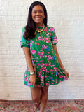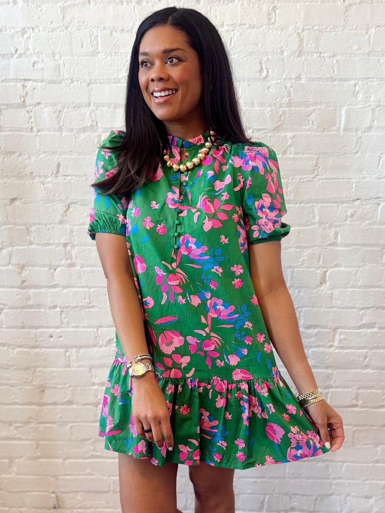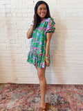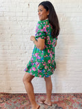 • Green Floral Print Dress with Puff Sleeves with Elastic