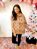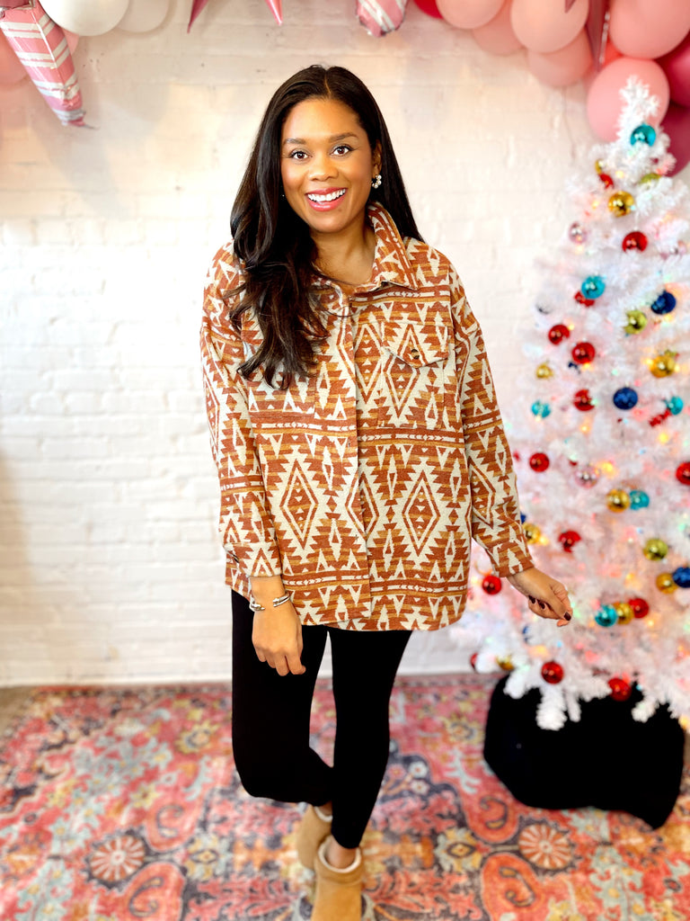 This Piper Shacket is perfect for the season! With it's mid-weight brushed flannel and functional pockets, you can enjoy the outdoor air indoors. The cheerful Aztec design and button-front provide style and warmth. Look cozy and cute!