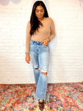 Your best outfits start with the Rose High Rise 90's Straight Jeans! Featuring a stretchy, light wash denim that shapes a high rise waist with five pocket cut and zipper fly. 90's Straight cut pant legs end with chewed hems with distressing at the knees.